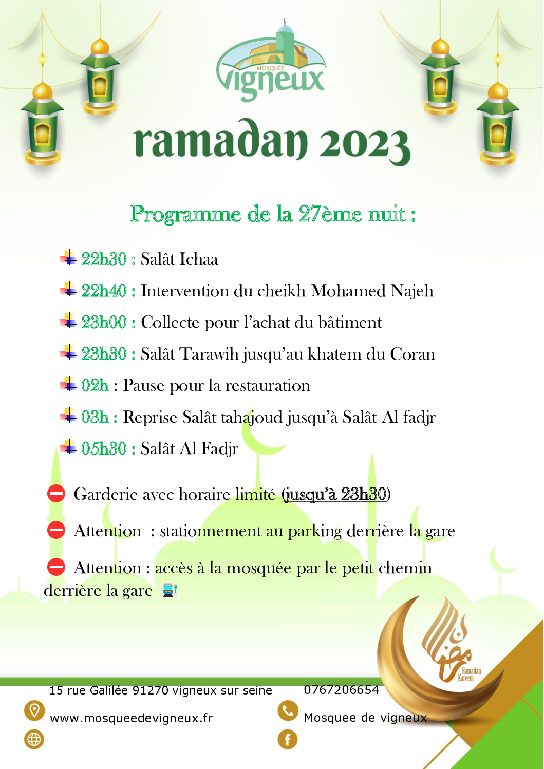 23h30 : Salât Tarawih jusqu’au khatem du Coran