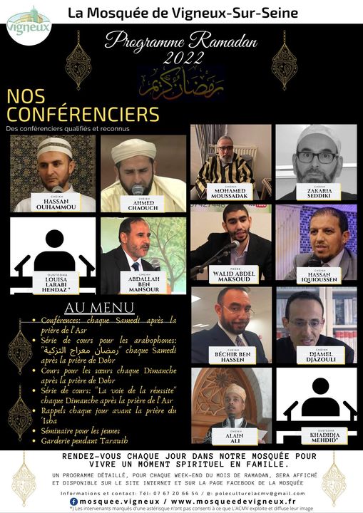Rendez vous chaque jour dans notre mosquée pour vire un moment spirituel en famille. Un programme détaillé, pour chaque week-end du mois de ramadan, sera affiché et disponible sur le site internet et sur la page Facebook de la mosquée.